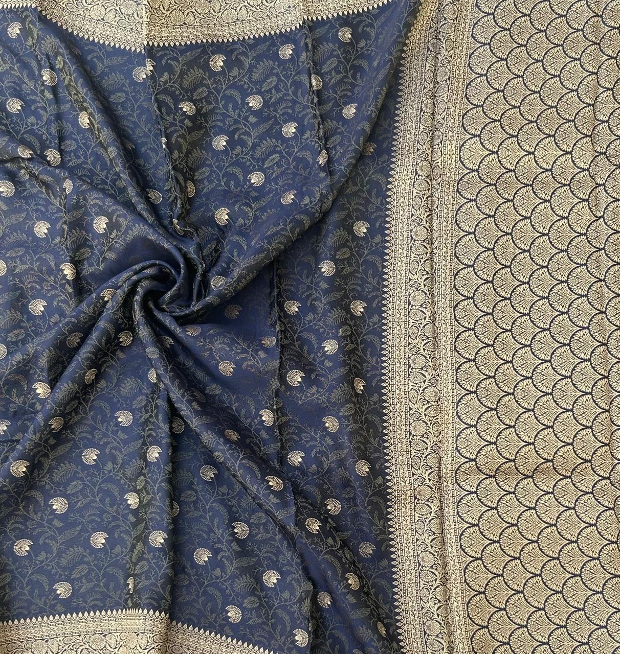This satin silk saree comes with golden zari woven buttas all over the saree with grand pallu and a plain running blouse with border