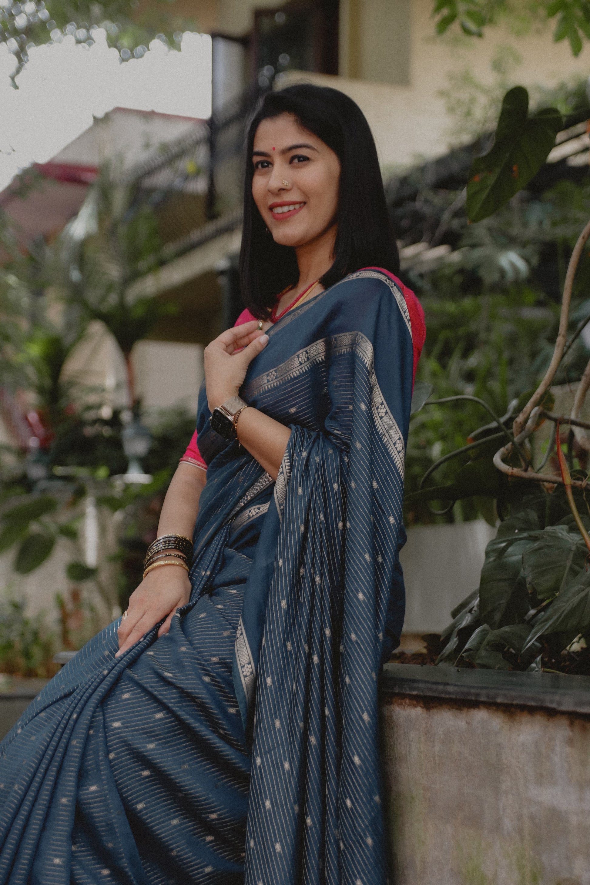 Suchira Peacock blue stripes bentex with contrast blouse saree