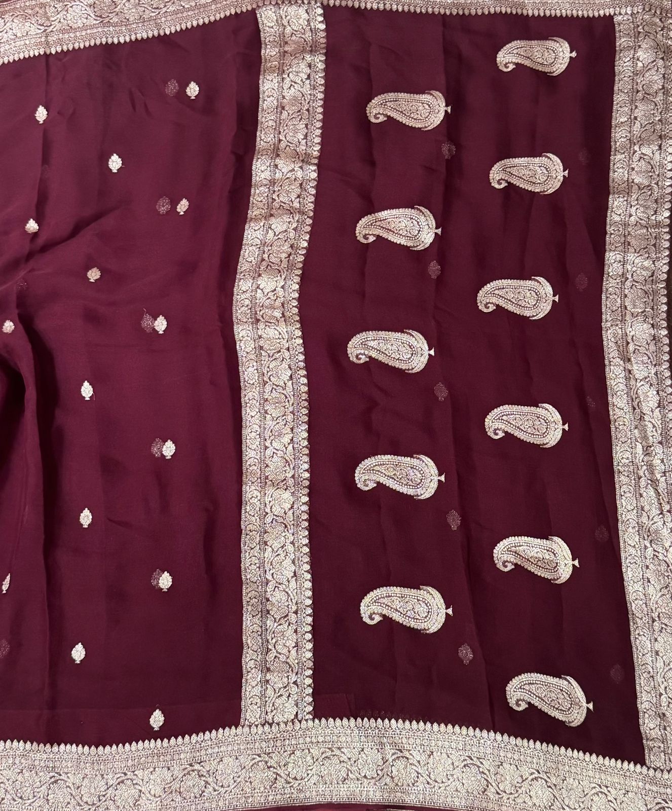 Drape yourself in the ultimate Banarasee luxury, this handwoven Pure-Chiffon displays beautiful intricate silver zari work across the body and pallu to embellish the subtle beauty. You can't help but fall in love with the work of art.