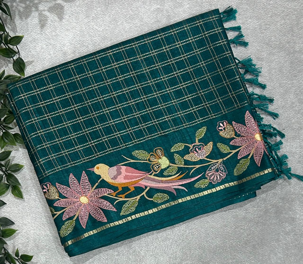 Dark rama green tussar checks embroidery border saree