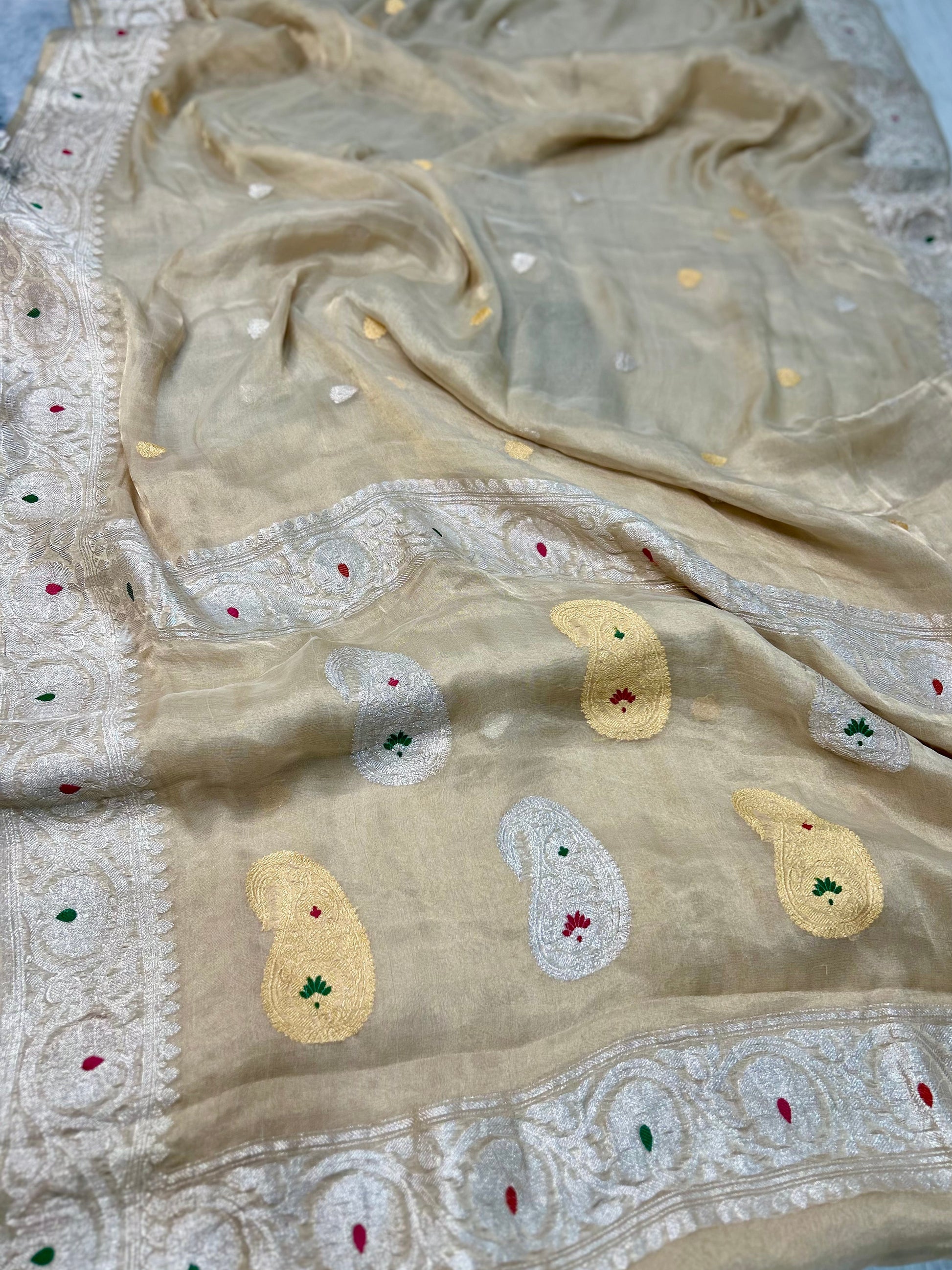 10Drape yourself in the ultimate Banarasee luxury, this handwoven Pure-Chiffon displays beautiful intricate silver zari work across the body and pallu to embellish the subtle beauty. You can't help but fall in love with the work of art.