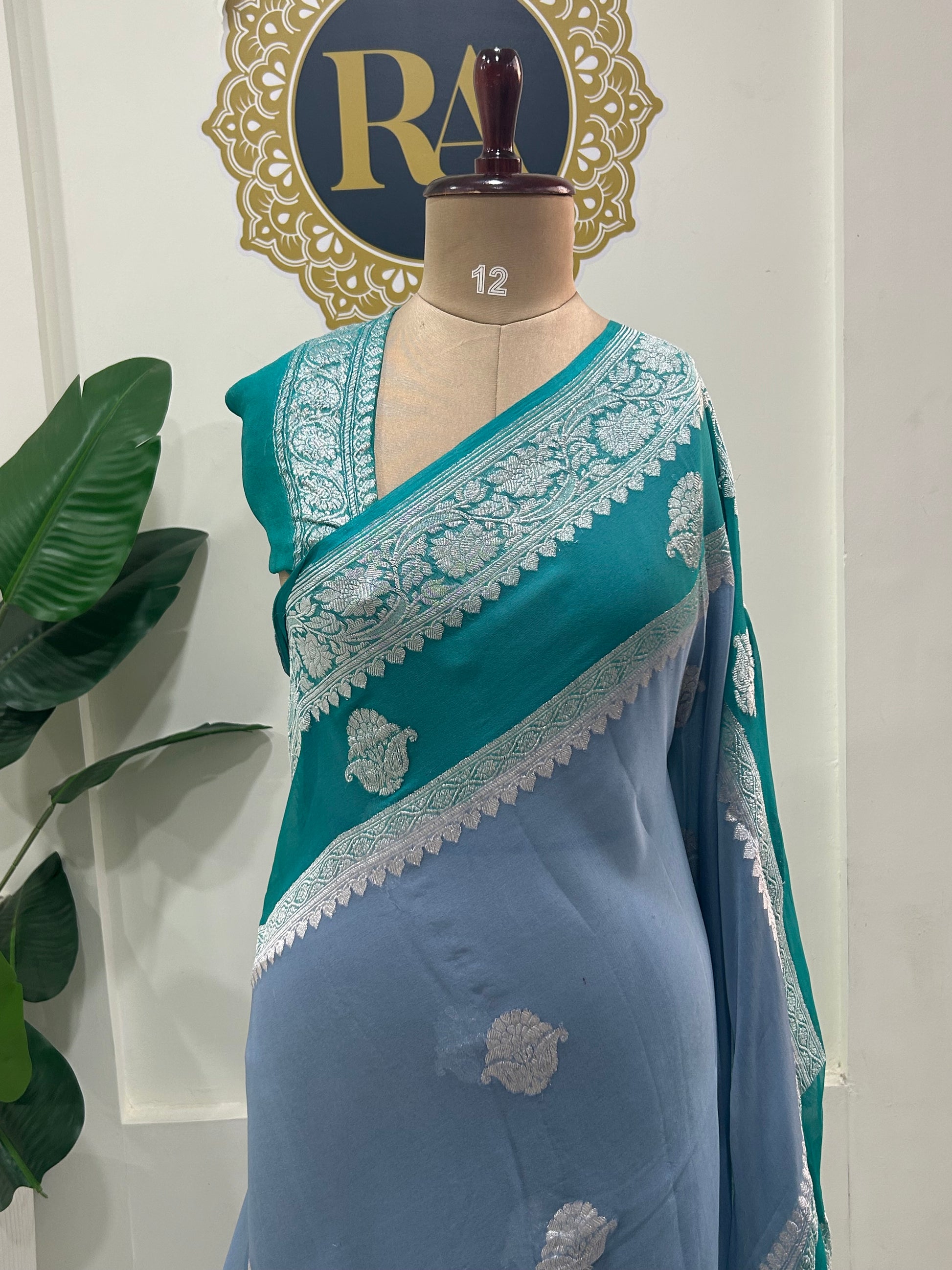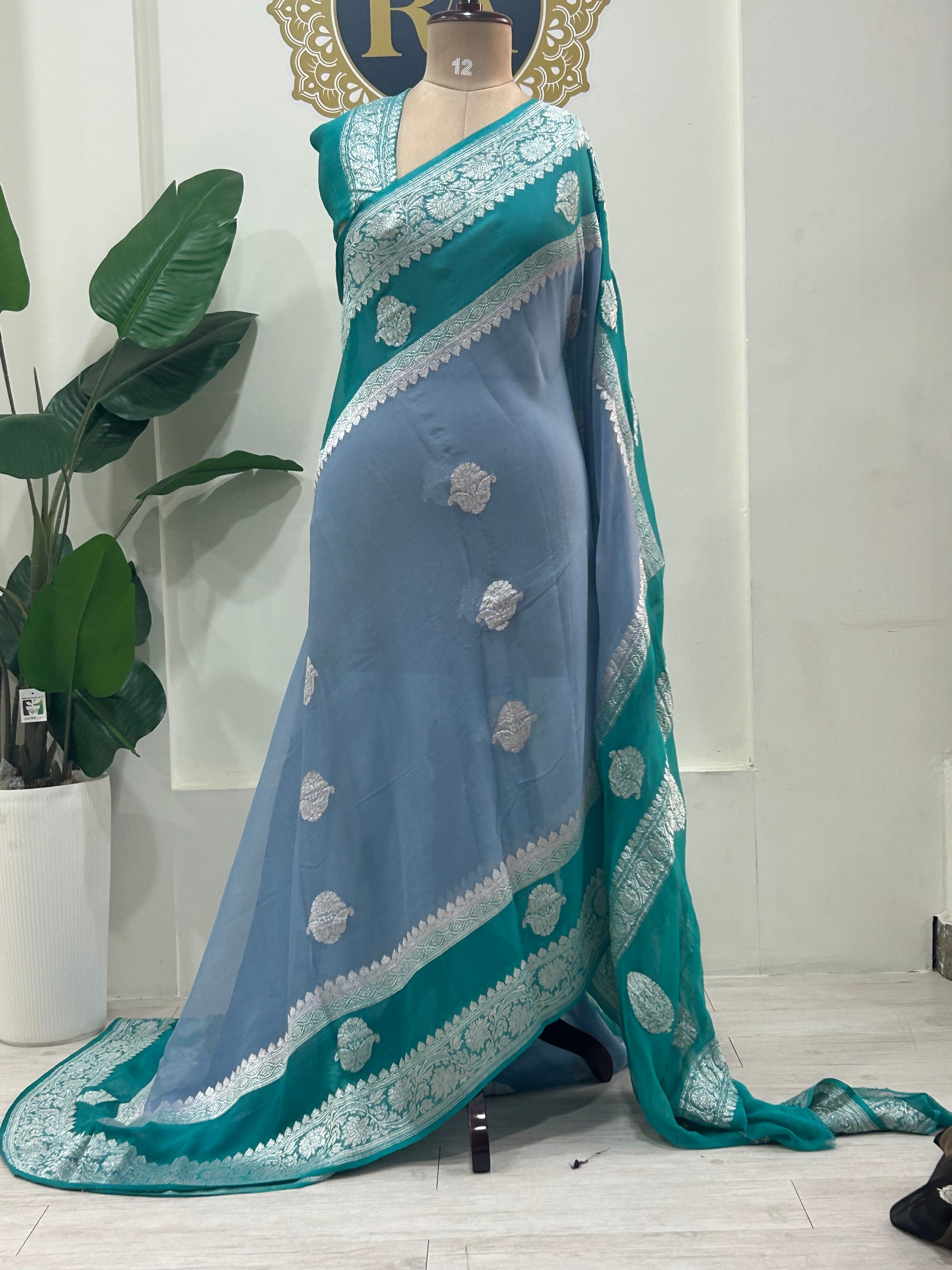 Grey n Rama green benarasi double border pure chiffon saree