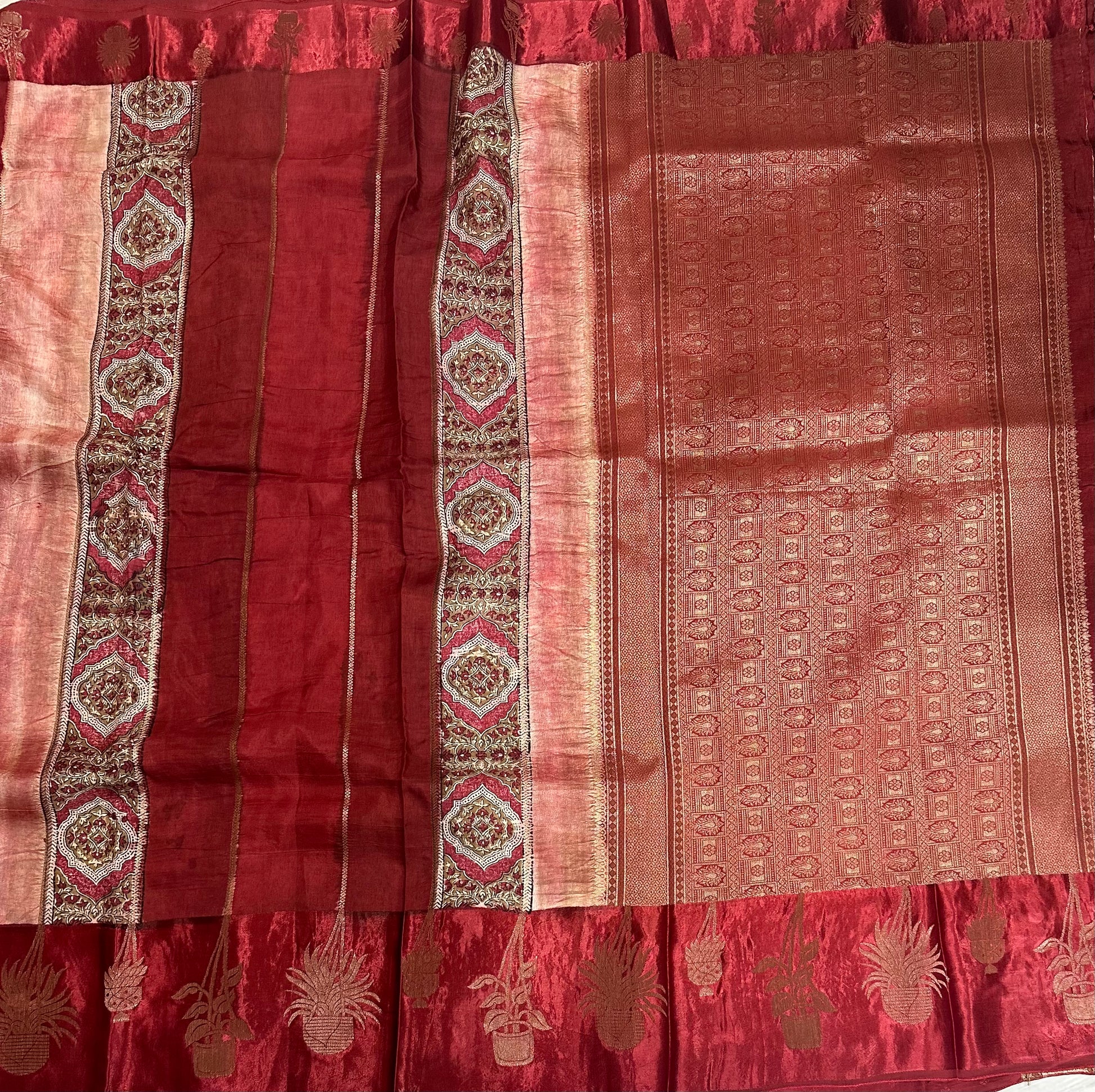 Maroon Elegant Dola Silk Fabric with Satin Border & Striped Design – Premium Ethnic Wear Material