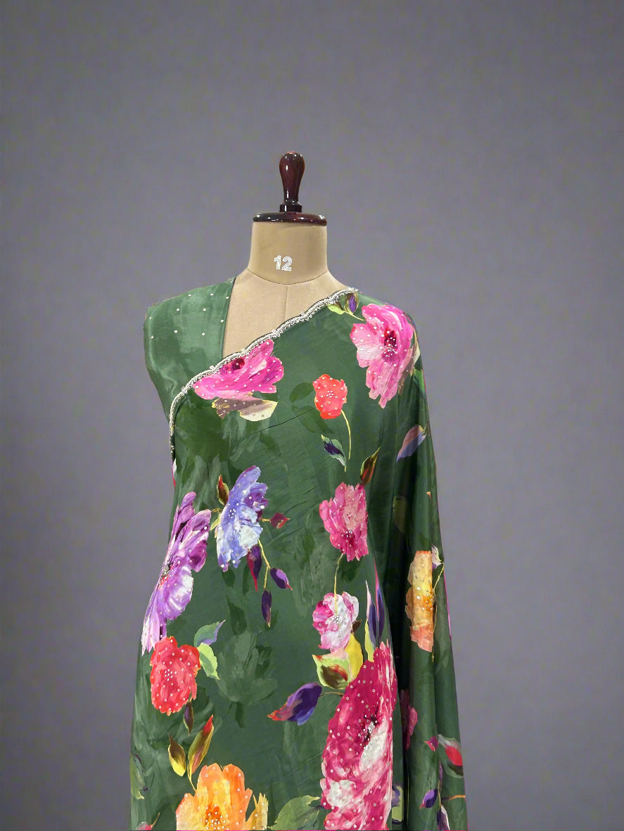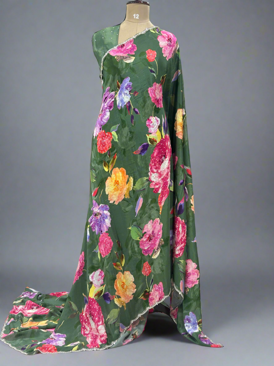 Dark green work scallop border printed pure crepe digital print party wear-09