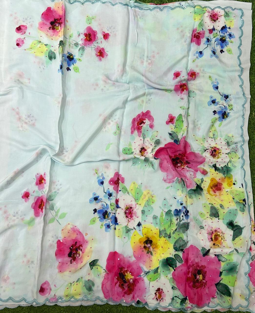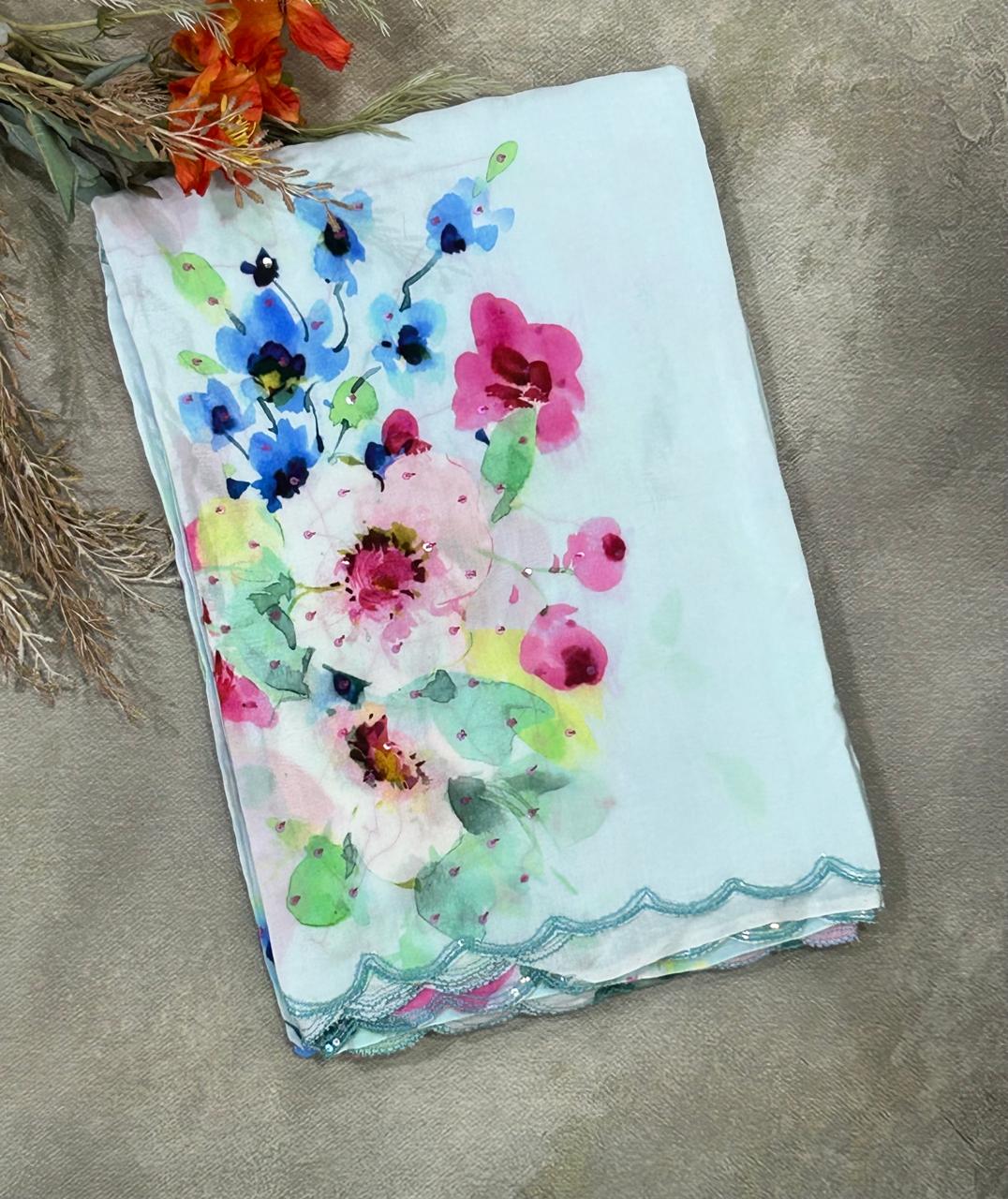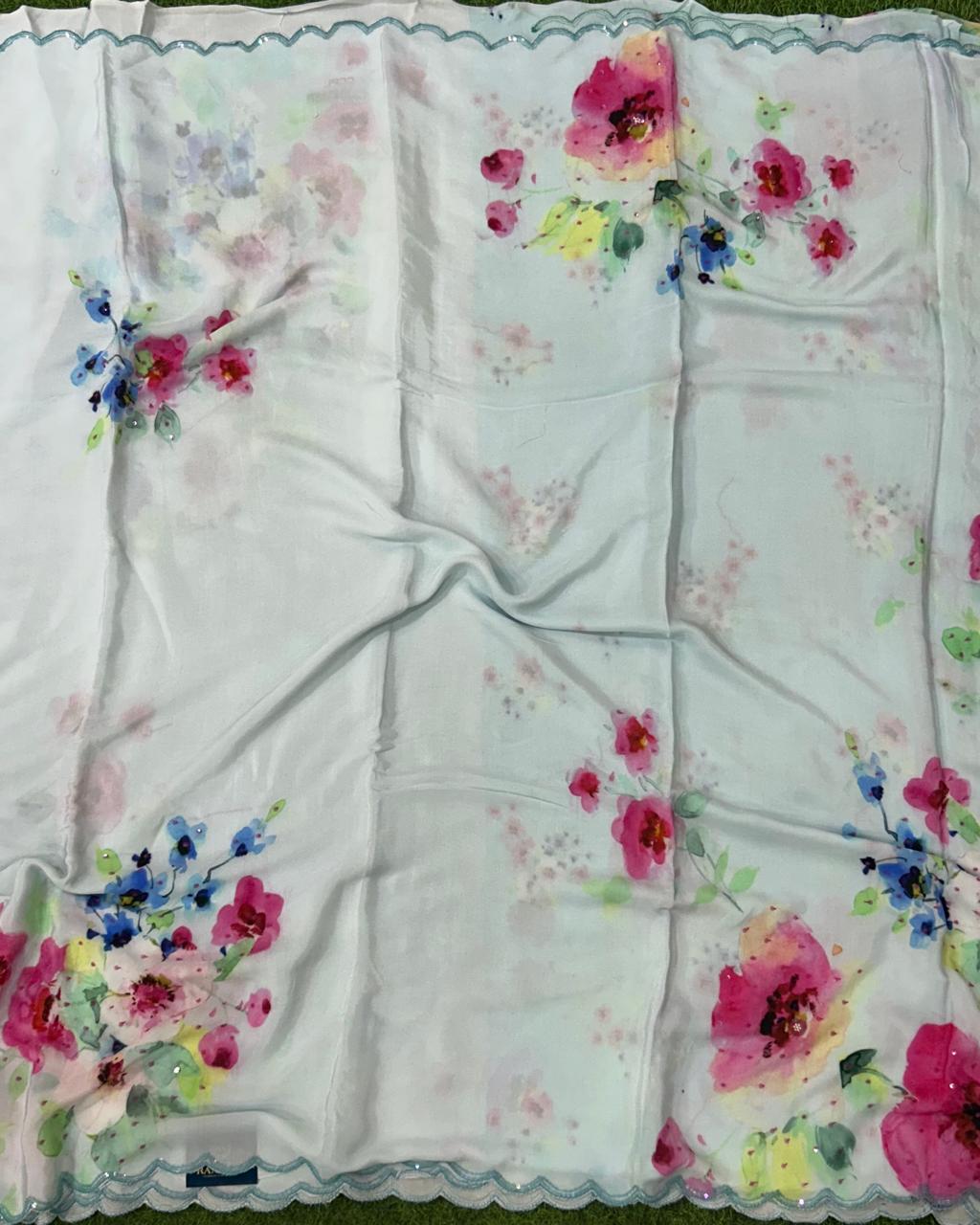 Sky blue sequins work scallop border printed pure crepe party wear saree