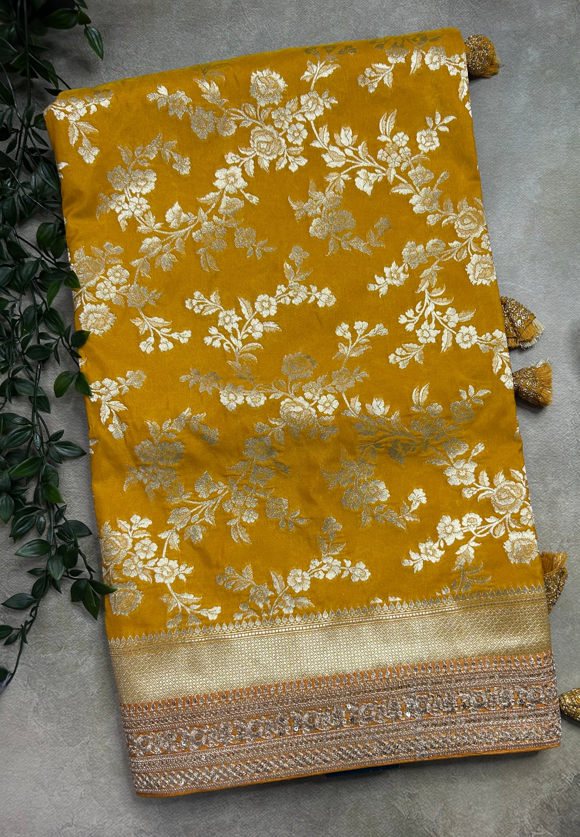 Mustard yellow jaal brocade party wear small border saree