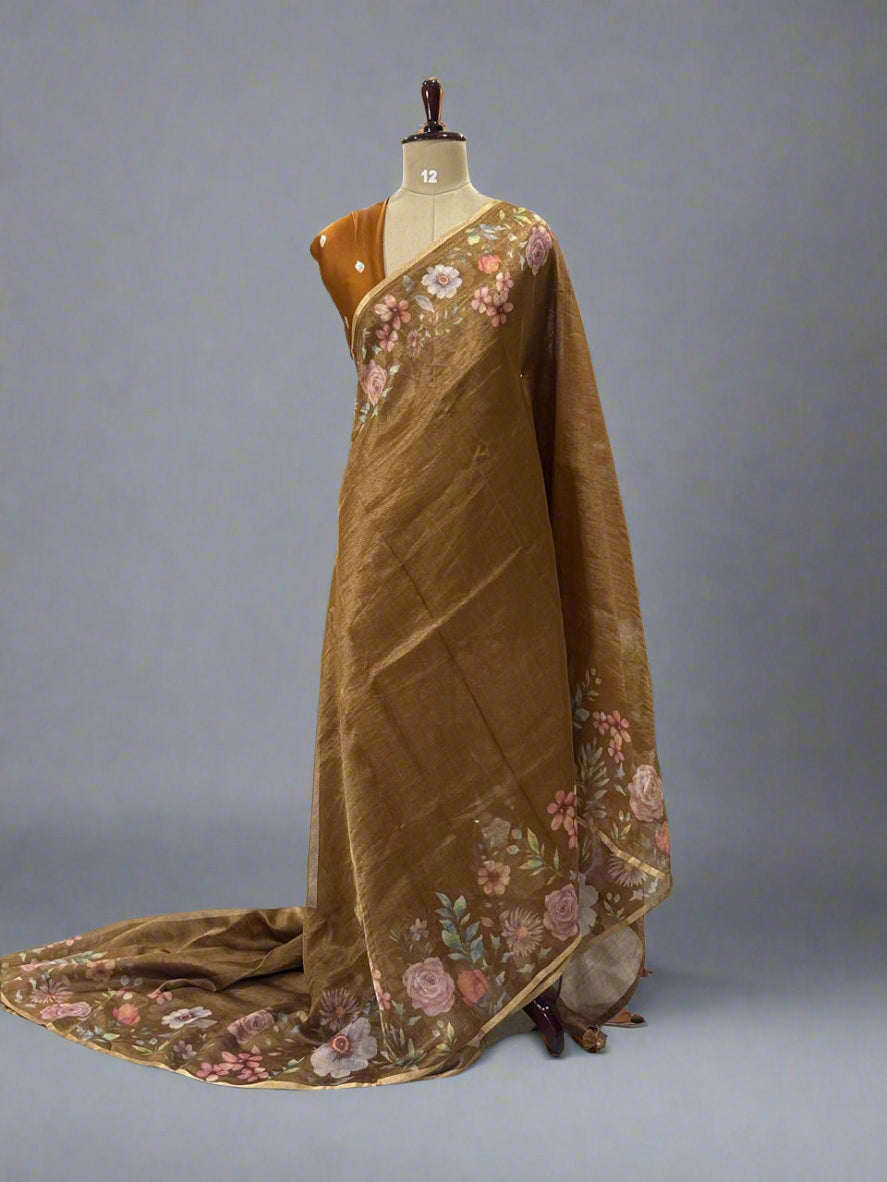 Mustard yellow Luxury Satin Tissue Digital Print Fabric – Soft, Elegant & Premium Quality