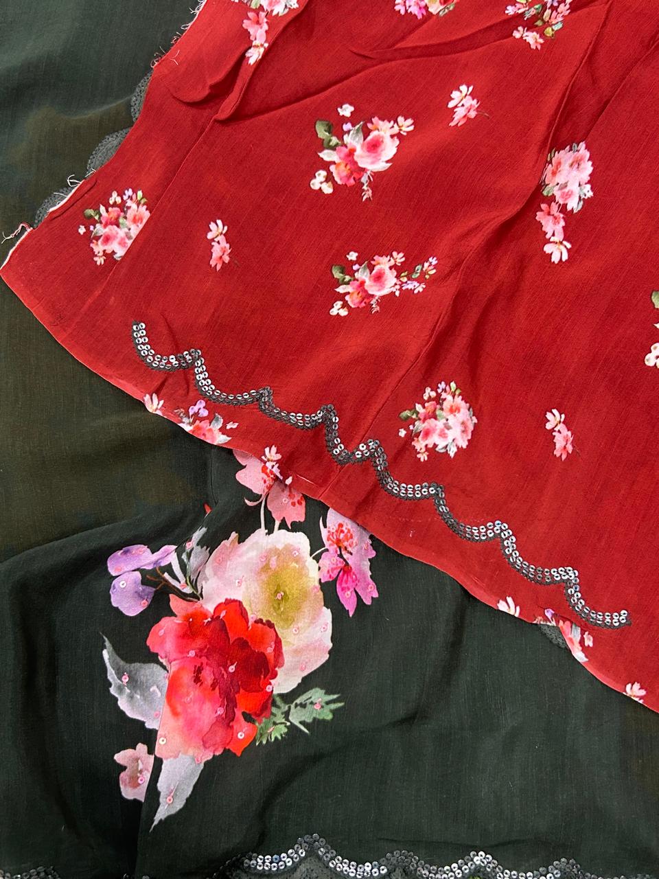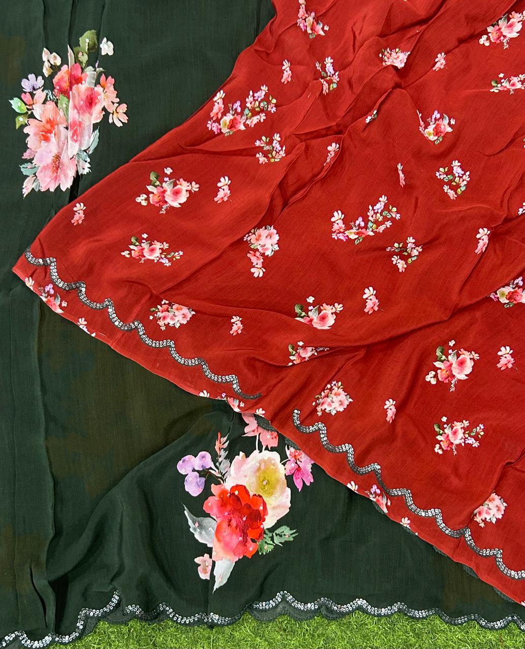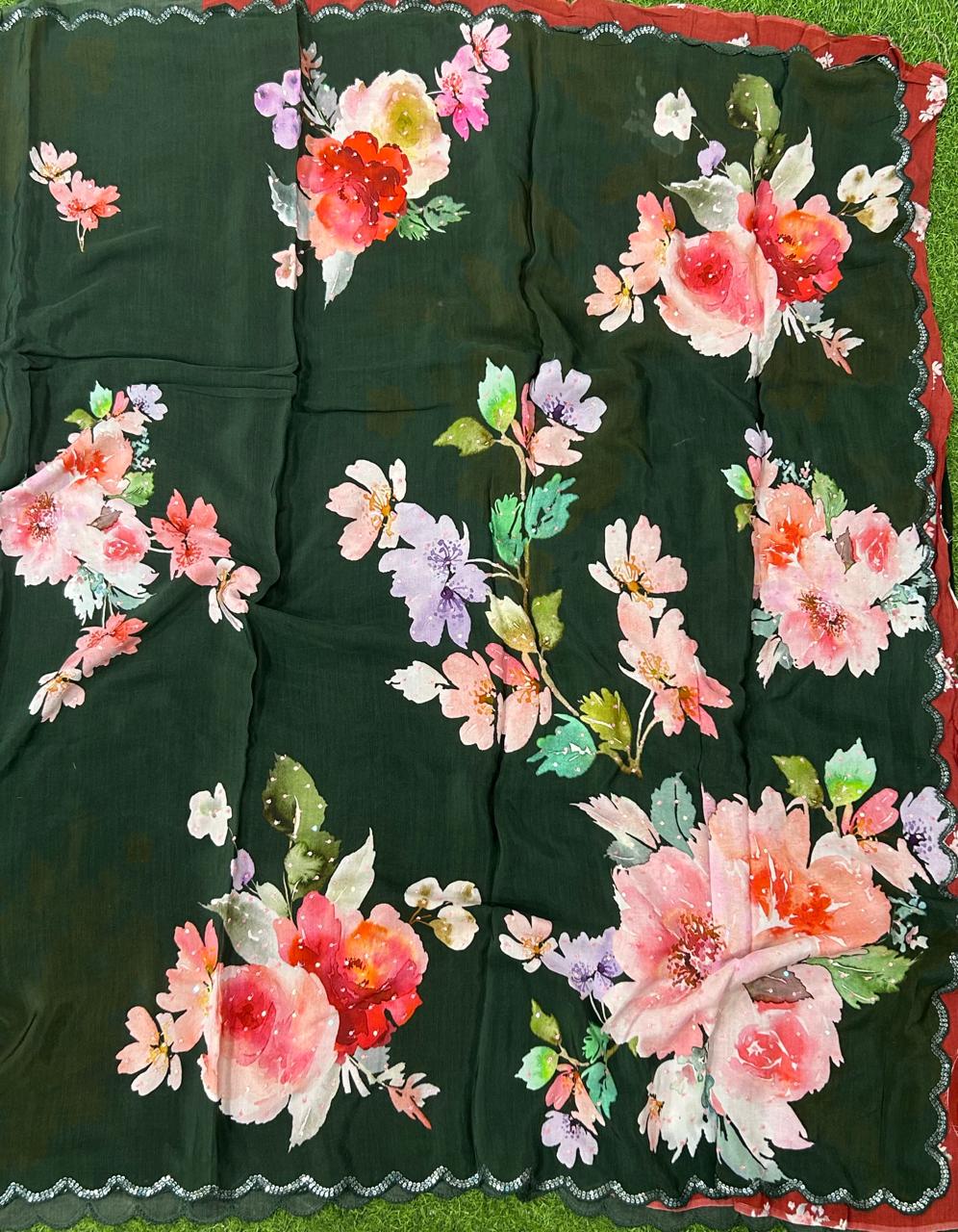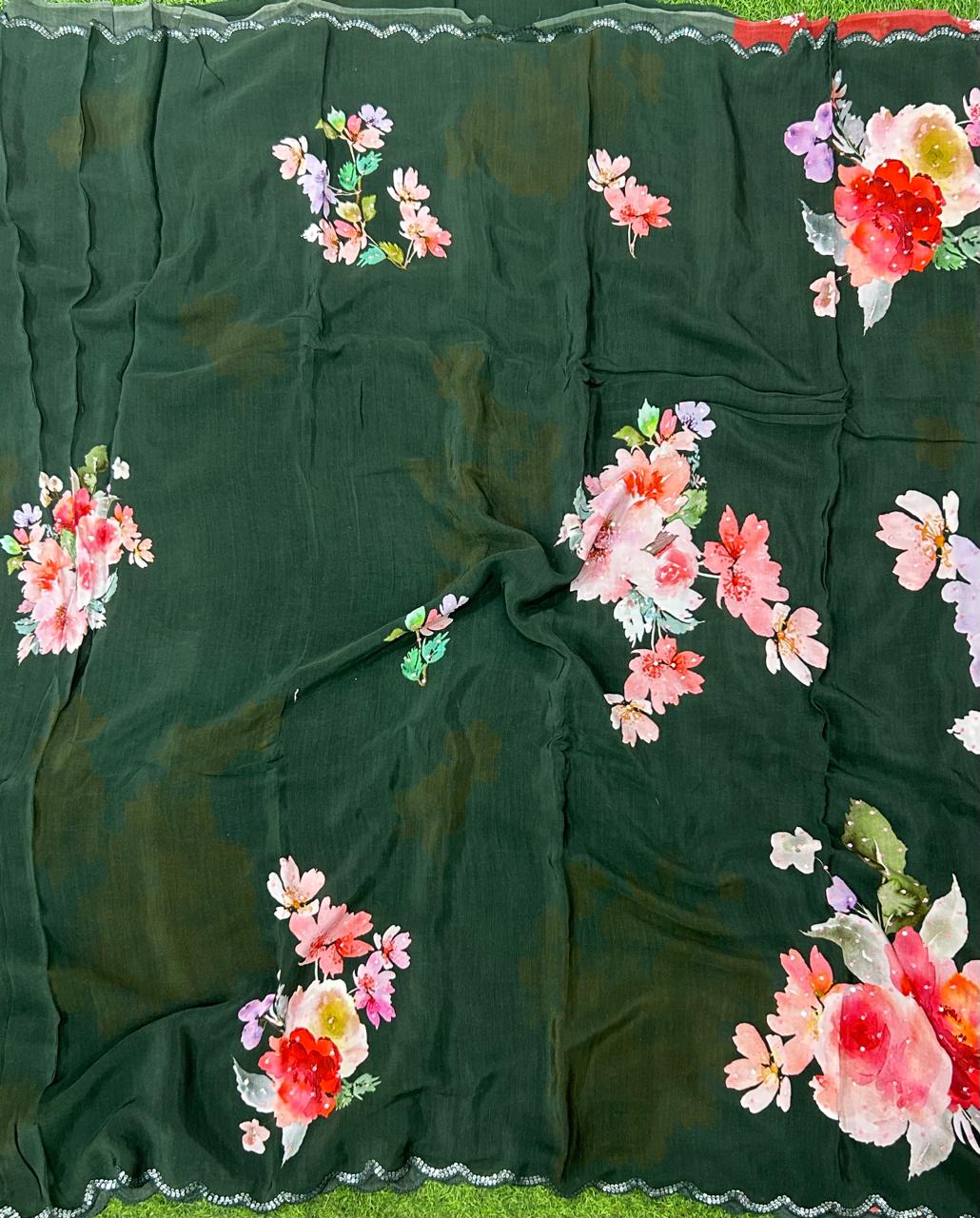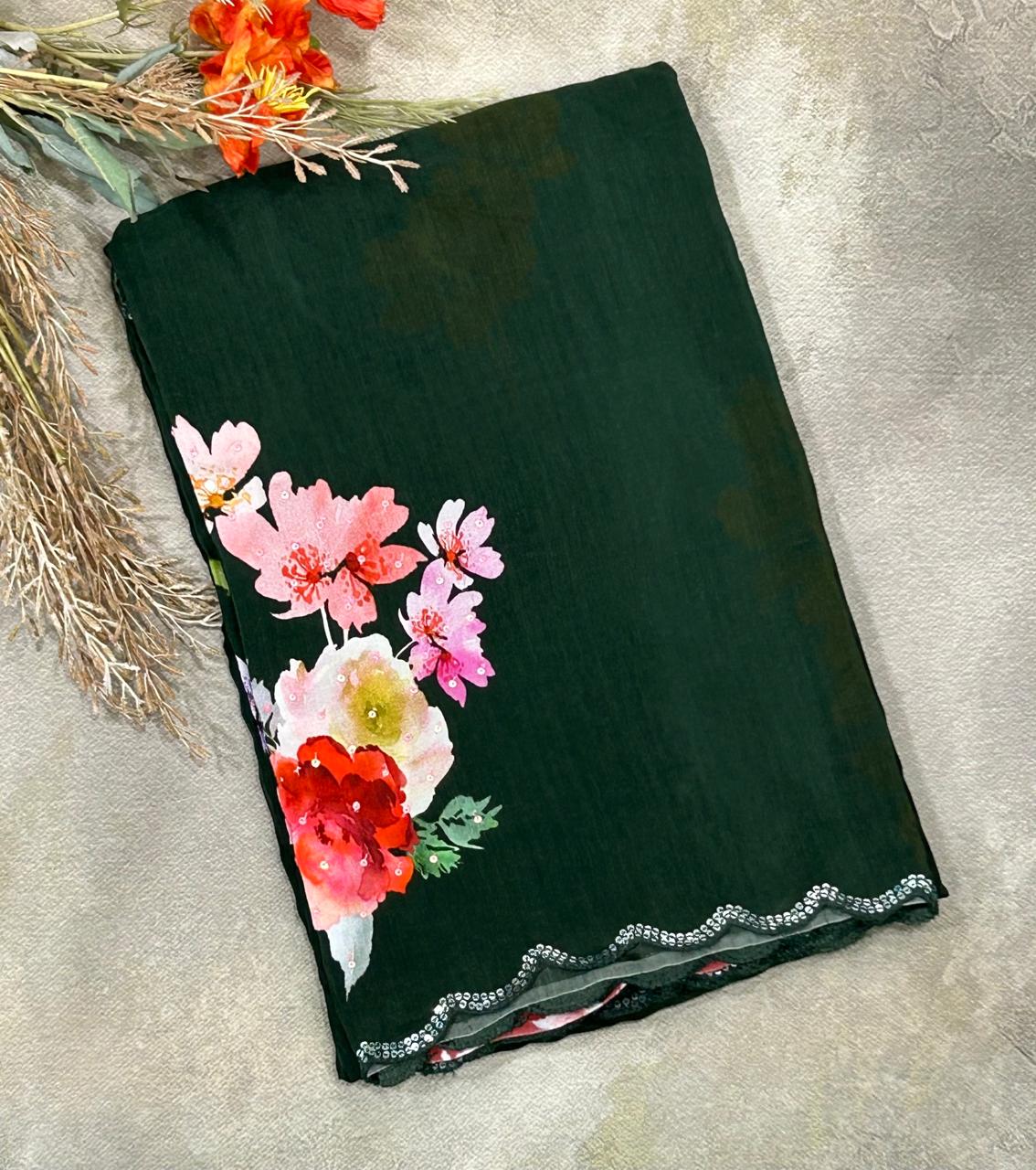 Bottle green sequins work scallop border printed pure crepe party wear saree