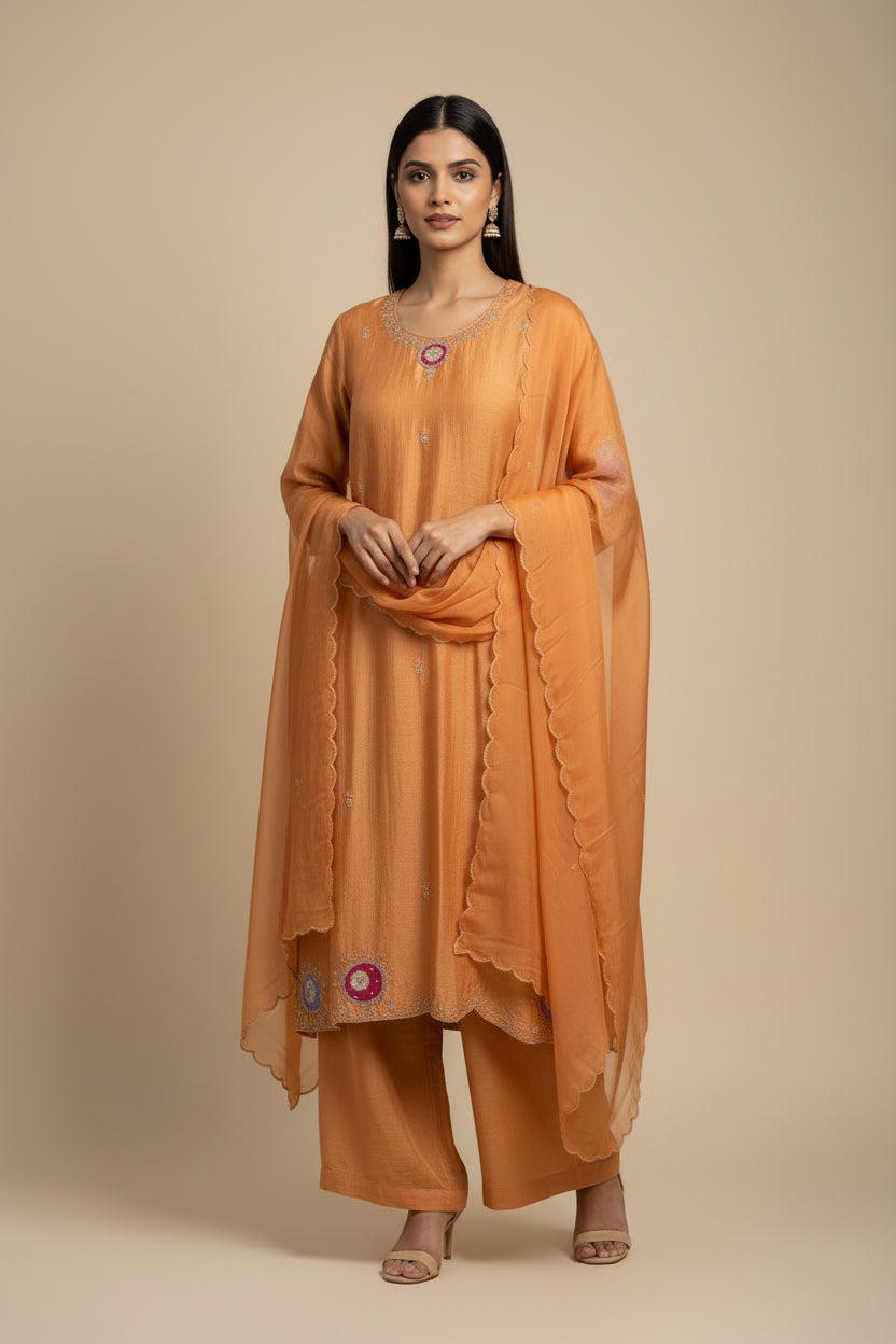 Orange Mul Chanderi Airline Handwork Kurtha
