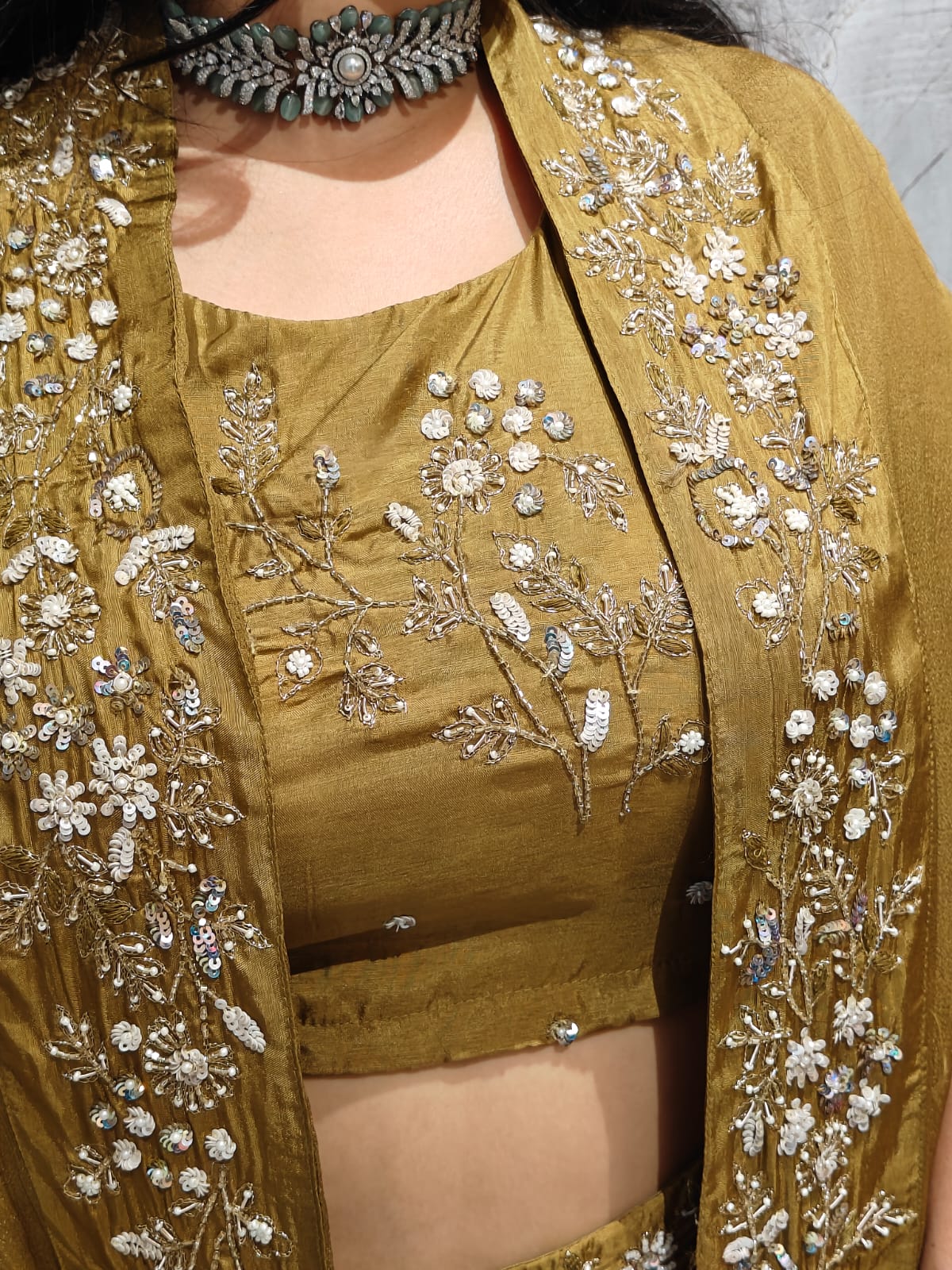 "PARI" Mehendi Green Designer Kurtha 43 Set with Handwork Top, Skirt and Cape Indo-western