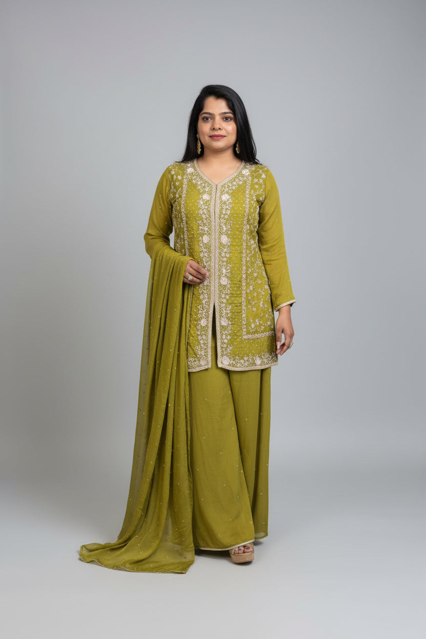 Pista Green Chinnon Hand Embroidery Sharara Kurtha 301
