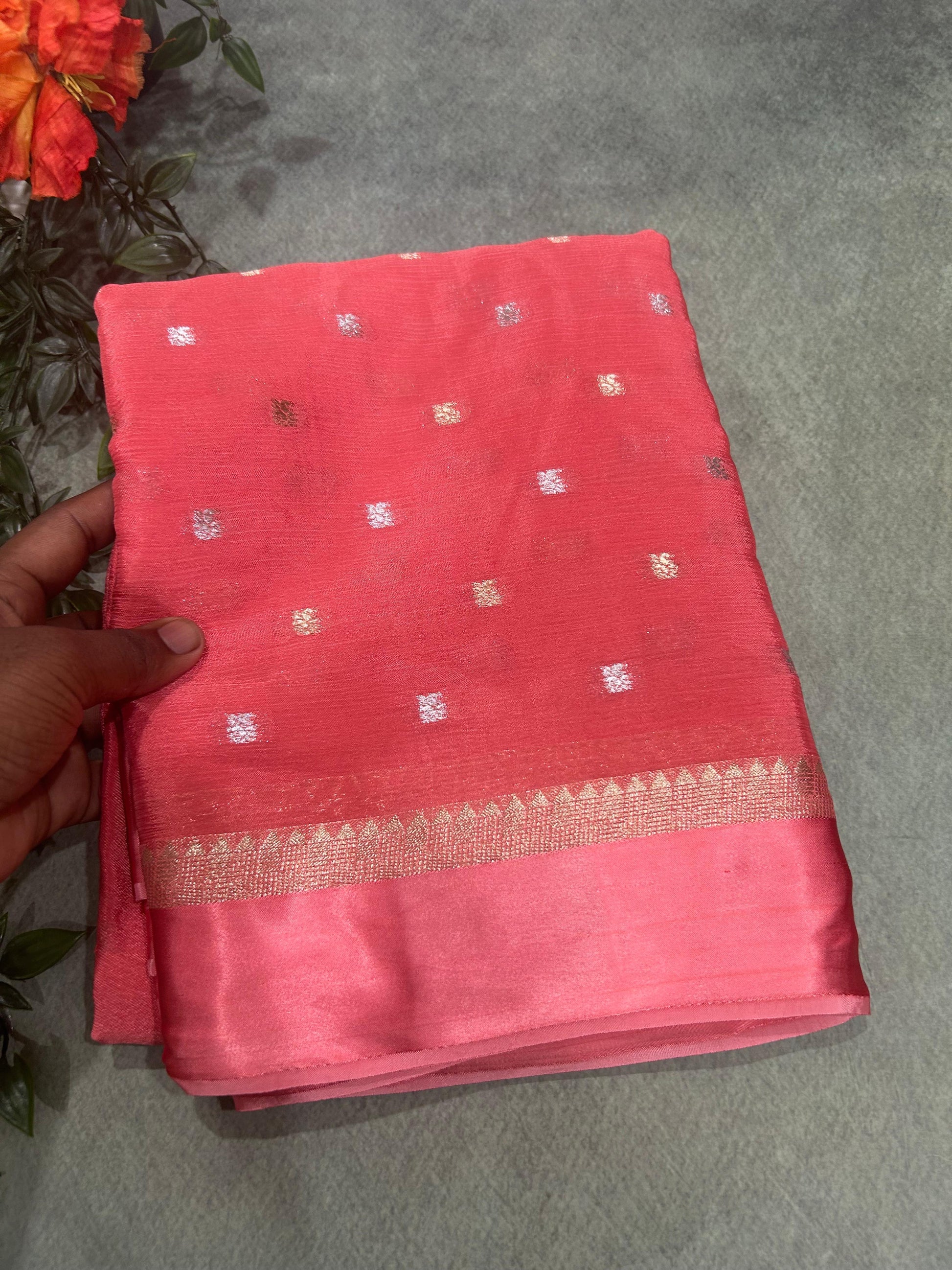 es. Our sarees are made using high-quality, authentic fabrics — whether it’s pure Banaras silk, handwoven cotton, Mysore silk, or georgette. Each product page mentions the fabric details clearly.