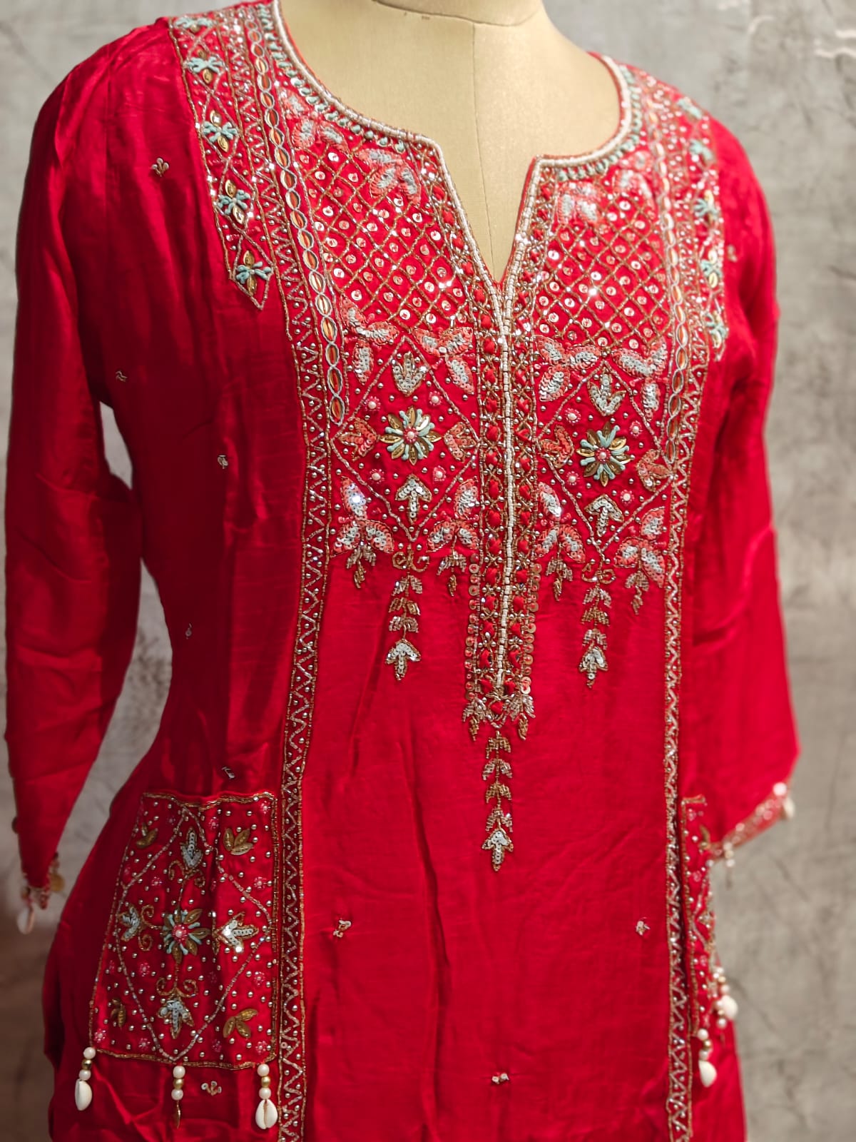 This beautiful suit, as a heavy handwork on the neckline , slevees and line work on the bottom of the kurtha , two beautiful pockets with embroidery workΒ .