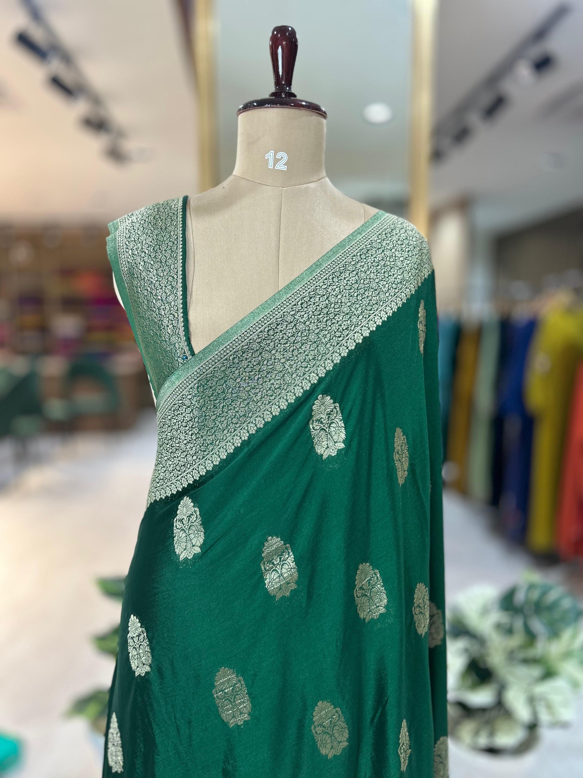 This soft georgette benarasi saree comes with golden zari butta with contrast border n blouse with a grand pallu and a butta contrast blouse