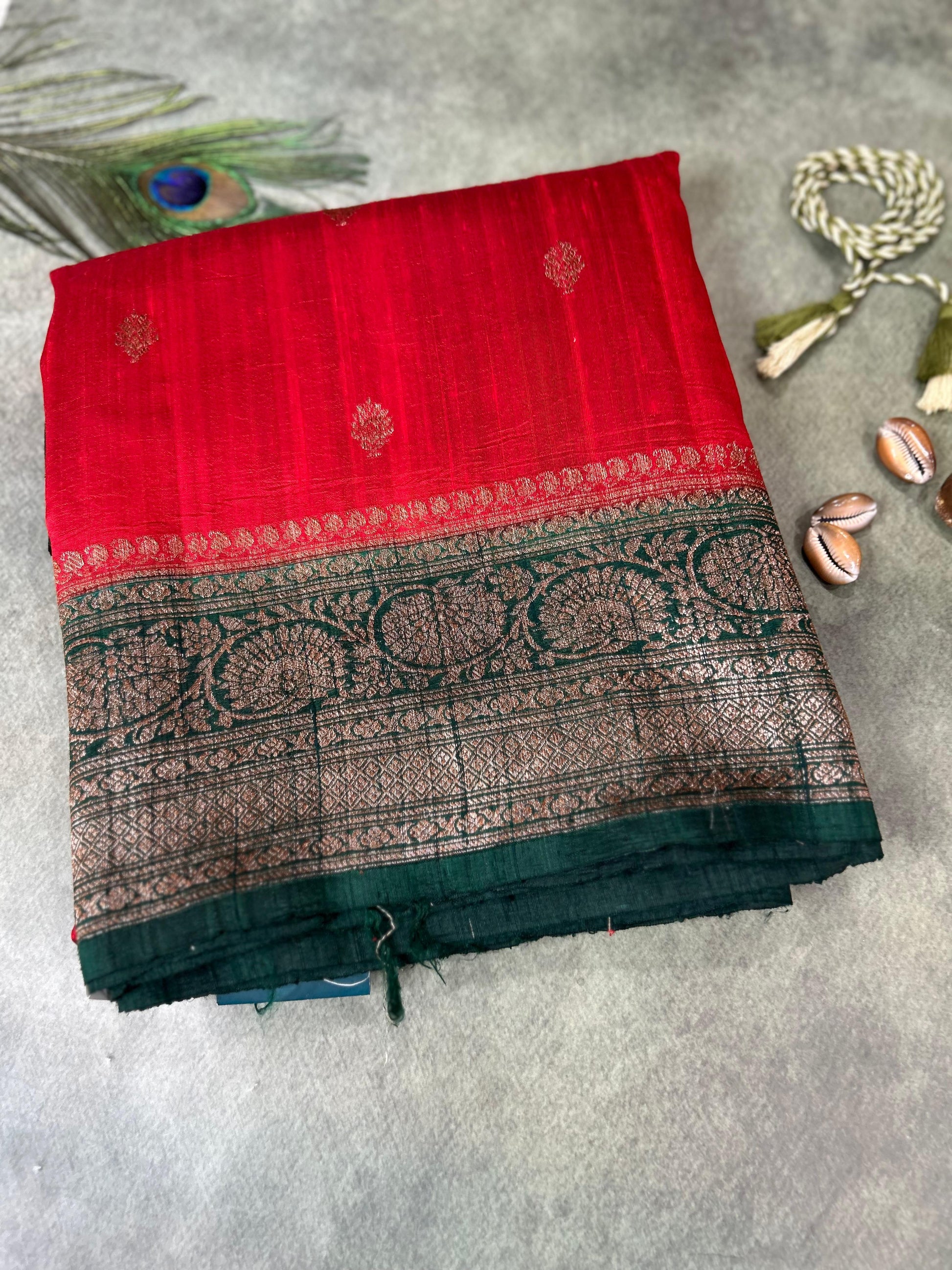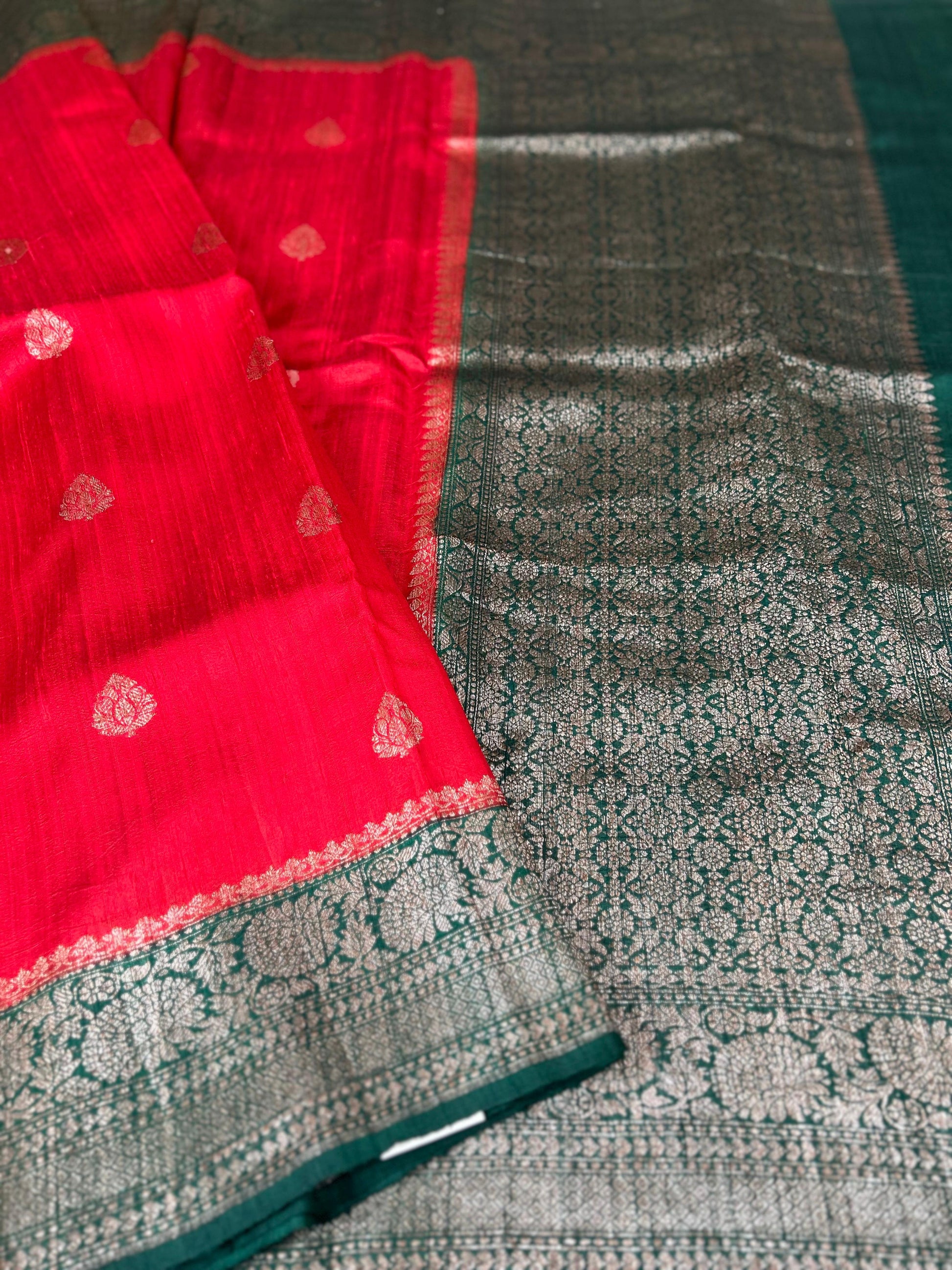 Red n bottle green small butta pure raw silk 102 saree