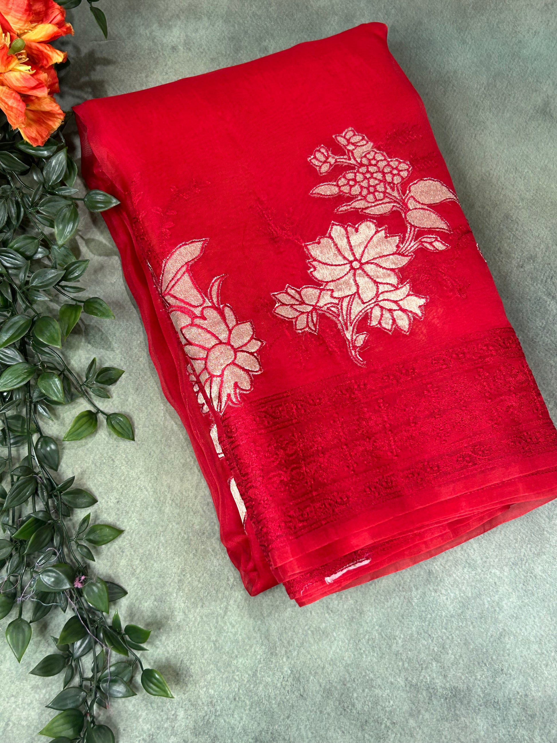 Drape yourself in the ultimate Banarasee luxury, Pure-Organza displays beautiful intricate silver and gold across the body and pallu to embellish the subtle beauty. You can't help but fall in love with the work of art.