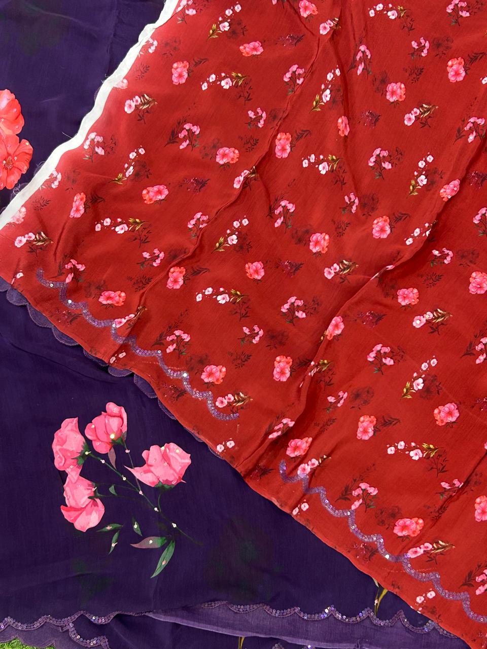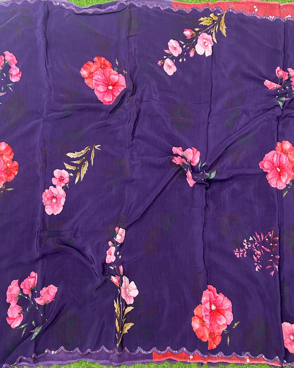 Navy blue sequins work scallop border printed pure crepe party wear saree