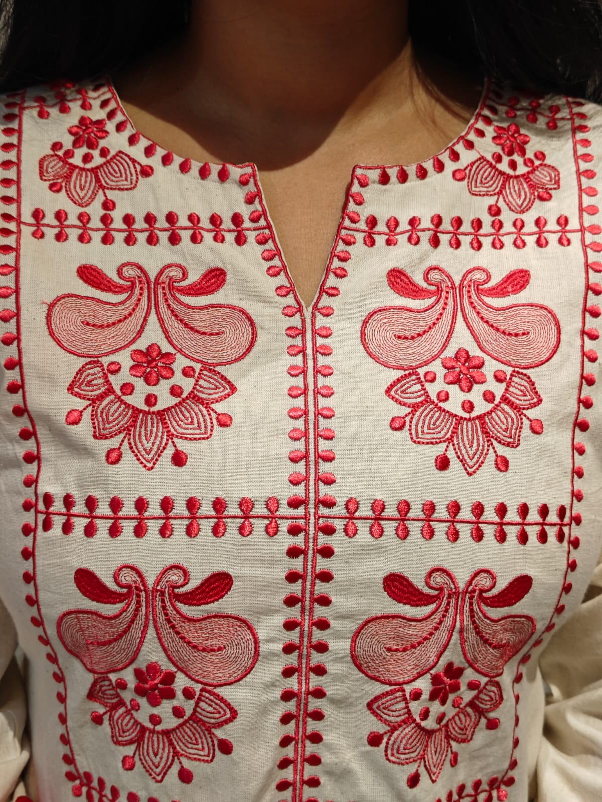 This Beautiful Kurtha set, is designed with thread embroidery work with pink thread in a flower pattern on the top and on the sleeves and on the bottom of the kurtha. which adds a touch of elegance to the outfit. which appearance in a cotton linen fabric.