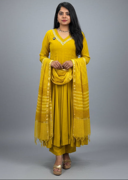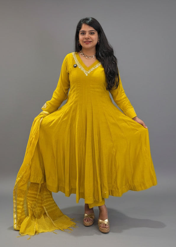 Yellow Mul Chanderi Anarkali Handwork Kurtha 621