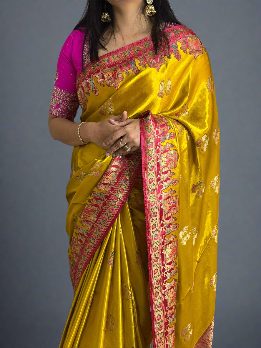 Yellow n pink pashmina satin crepe 08 saree